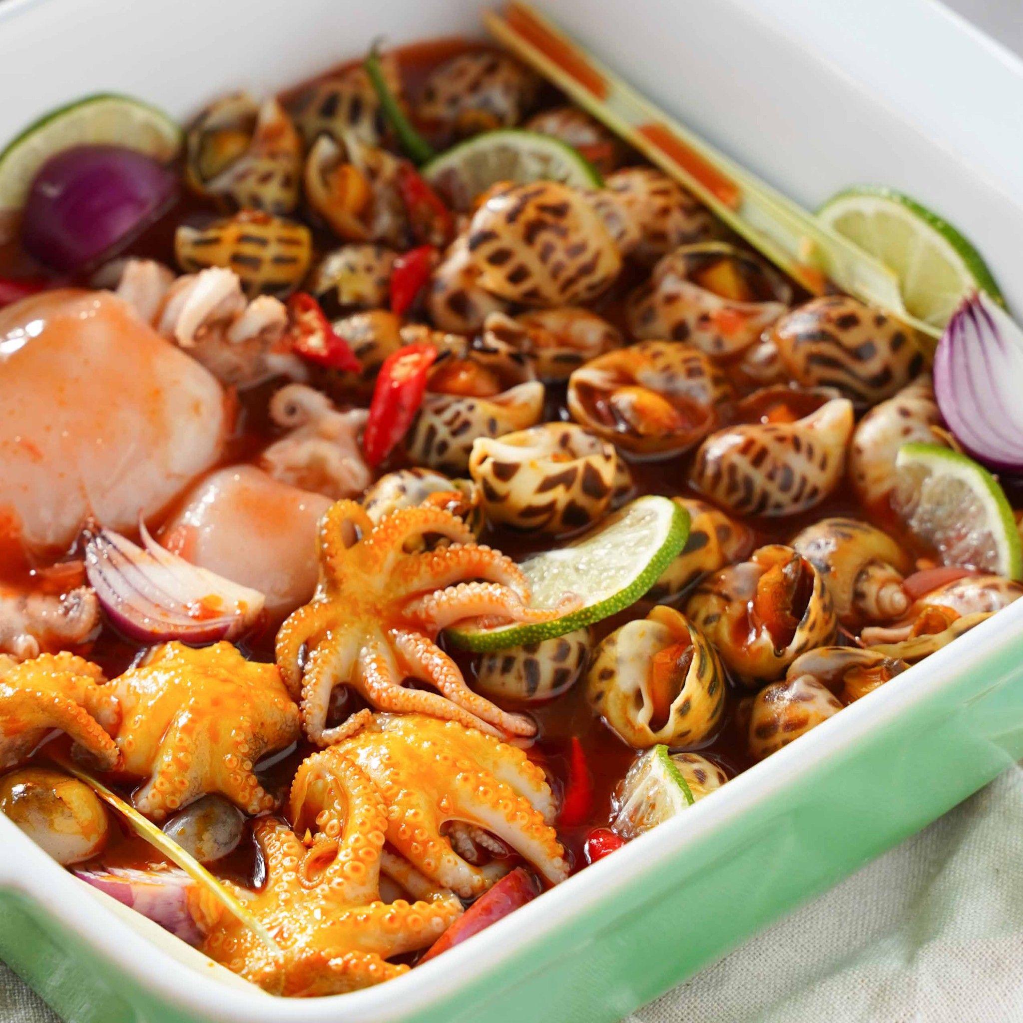 Ốc hương thơm ngon thịt giòn cùng với mực nang baby giòn ngọt và bạch tuột baby dai tạo nên combo đặc trưng lạ miệng, kết hợp cùng sốt thái chanh sả chua chua ngọt ngọt cay cay, phảng phất mủi sả và mùi thơm hải sản, ngon đúng bài, làm hài lòng thực khách.