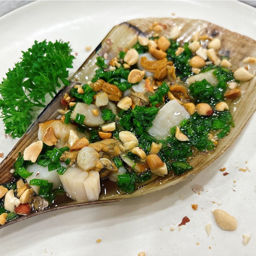 Sò mai size Đại tươi ngon, thịt dày, chắc và ngọt tự nhiên, được nướng vừa chín tới để giữ trọn vị biển. Phần mỡ hành xanh mướt, thơm lừng được rưới đều lên từng con sò, hòa quyện cùng đậu phộng rang bùi béo, tạo nên hương vị quen mà cuốn đến khó cưỡng.